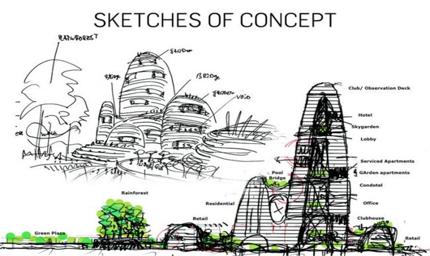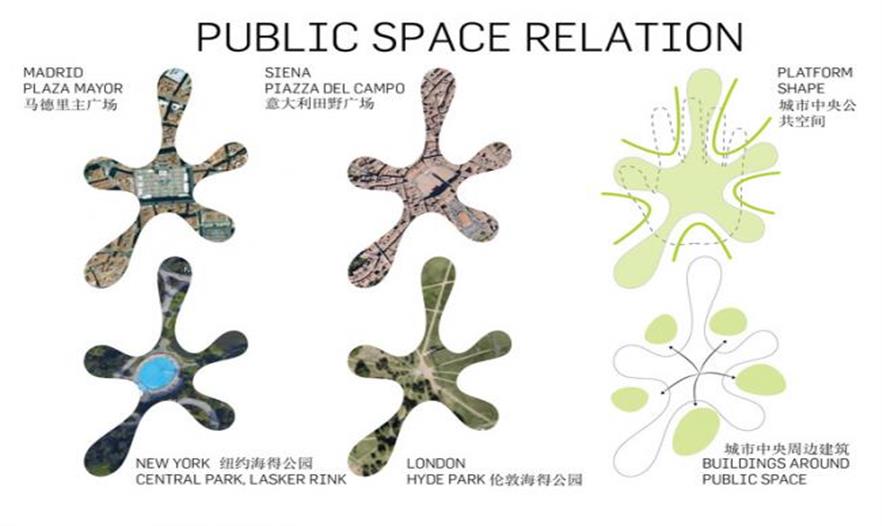 “我們在這里提出了逆城市天際線,以公共空間作為地標(biāo)的設(shè)計(jì),而不是事物/建筑。我們的中央空間是一個(gè)雨林谷和演示公式:人民=城市,從建筑到一個(gè)地方。”