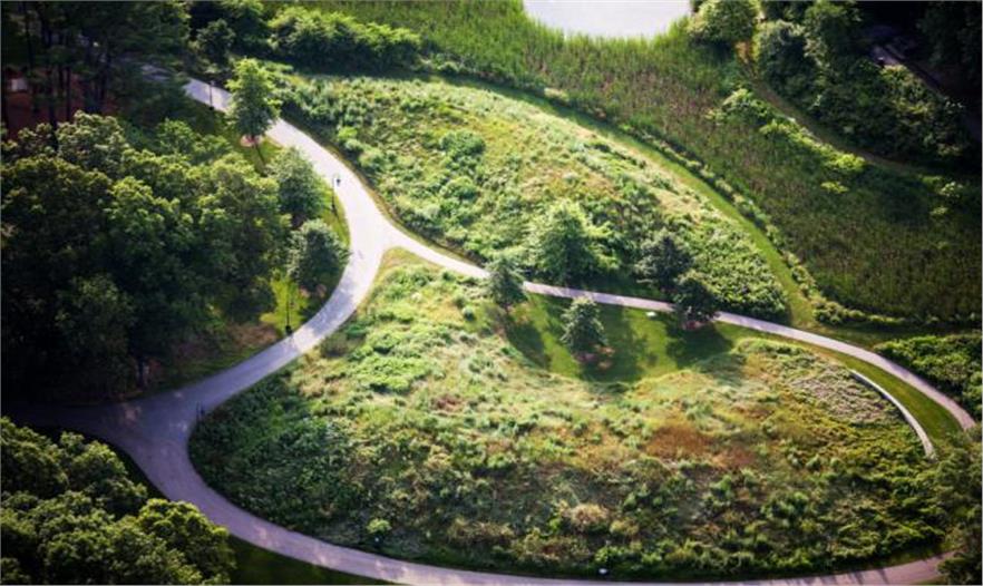 Michael Van Valkenburgh Associates事務(wù)所與韋爾斯利學(xué)院合作復(fù)興Alumnae Valley有毒的棕地,該區(qū)域之前是該學(xué)校的電廠、工業(yè)化天然氣泵站和一個(gè)175個(gè)位置的停車場。該事務(wù)所利用幾大策略改善了被污染的土壤:移除最具毒性的土壤,覆蓋和收集輕微污染的土壤,然后找方法將其作為該景觀的一部分。該區(qū)域原來是由冰河時(shí)代的冰川塑造而成的。這些道路沿線的山丘模擬原始的土地塑造形態(tài),同時(shí)儲(chǔ)存被修復(fù)的土壤。地勢、水文和校園生活的結(jié)合讓Alumnae Valley重新與周邊環(huán)境和諧發(fā)展起來。