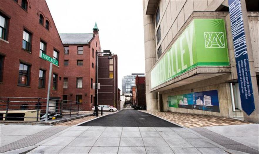 19世紀(jì)90年代,波士頓的后灣社區(qū)建在了一個(gè)垃圾填埋場上,在樹木林立的街道沿線是一排排精致的褐色砂石,而建筑后面是公共通道,為貨物遞送、垃圾儲(chǔ)存和停車設(shè)置服務(wù)區(qū)。Green Alley位于公共小道444的波士頓建筑學(xué)院(BAC)里,該學(xué)院951波伊斯頓街建筑和320紐伯里街建筑之間。它得以重新設(shè)計(jì),通過可滲透瀝青和鋪裝系統(tǒng)、基質(zhì)過濾通道表面和2個(gè)BAC屋頂?shù)挠晁毓嗟叵滤?。在地下,地?zé)峋?wù)于該學(xué)院的核心建筑,引領(lǐng)BAC達(dá)到零增長校園能源目標(biāo)。波伊斯頓街建筑的2邊覆有一個(gè)垂直的鐵絲網(wǎng),進(jìn)行綠化設(shè)計(jì),幫助減少這個(gè)狹窄城市谷的溫室效應(yīng)。