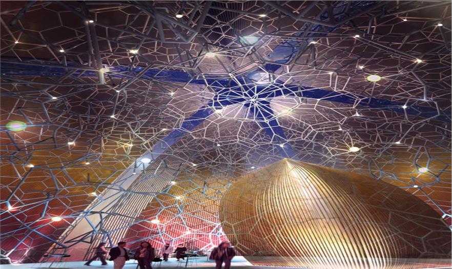 在該項(xiàng)當(dāng)中荷花在美觀上和結(jié)構(gòu)上的表現(xiàn)都發(fā)揮了重要作用。中心的五邊形網(wǎng)格運(yùn)用了自然界中常見的比例,也包括荷花的結(jié)構(gòu)組織。其標(biāo)志性的“花瓣”設(shè)計(jì)就是從天然花朵中獲得的靈感,其中包括了翅片,貝殼,釉面板和網(wǎng)格支持體。在里面,主中庭上的天花板與自然荷葉的顏色和圖案相對(duì)應(yīng),引導(dǎo)著游客從主廳到觀眾席入口。