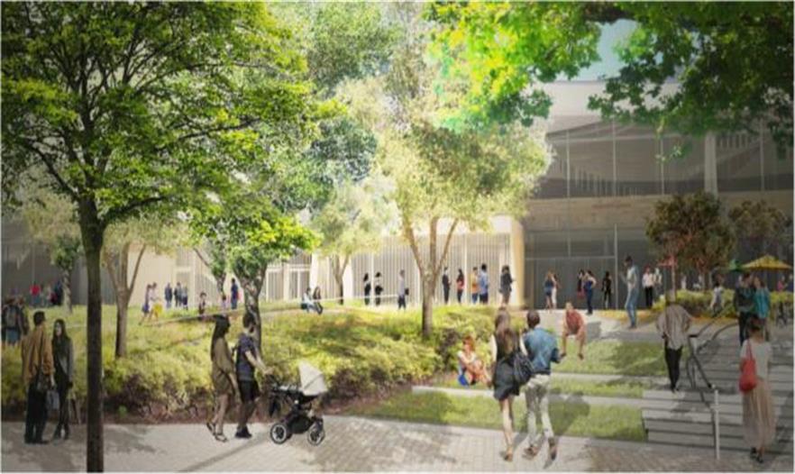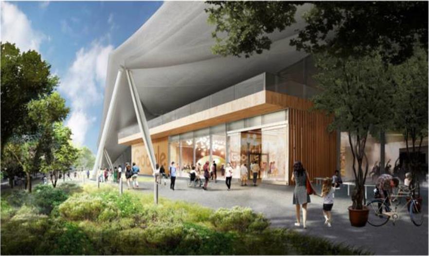 這個5.5277萬平方米(59.5萬平方英尺)的2層結(jié)構(gòu)由一個占地1421平方米(1.53萬平方英尺)的室內(nèi)步行道分割成兩部分,成為建筑中心的一個小型公共廣場。這條道路從頭到尾都是零售店。其中央廣場周圍也會有零售店,總共占地929平方米(1萬平方英尺)。這些區(qū)域與一個廣闊的景觀區(qū)域連接,公眾都能進(jìn)入大部分區(qū)域,與該城市廣闊的綠道和人行道網(wǎng)聯(lián)系起來,被稱為綠色環(huán)道。根據(jù)市政府分享的其他文件,該項(xiàng)目將需要移除該區(qū)域196棵遺留的樹木。由于部分加利福尼亞環(huán)境質(zhì)量法案,這些樹木將由392棵新樹種替代。