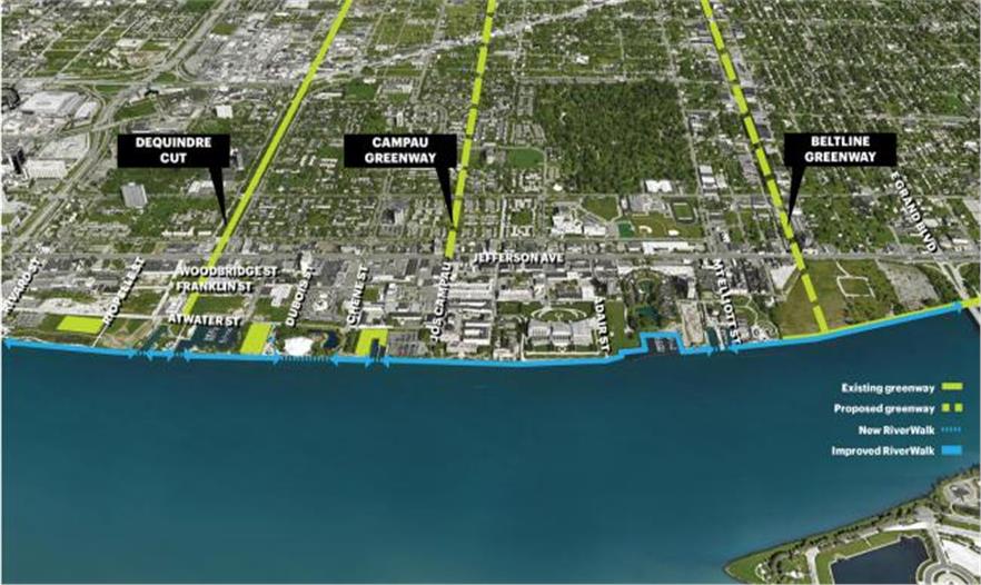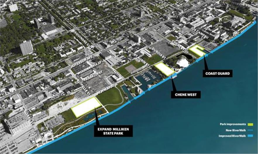 這次計劃描繪了一個“大眾河岸”的美好愿景,秉持兼容性,易接近的原則,積極促進(jìn)城市和經(jīng)濟(jì)的發(fā)展。底特律河岸的很大一部分用地將會被保留下來,成為公園和開放綠地。之前的私人建設(shè)用地也將全部轉(zhuǎn)換為公園對大眾開放,在東河岸打造接近8英畝(約32000平方米)的公共空間。