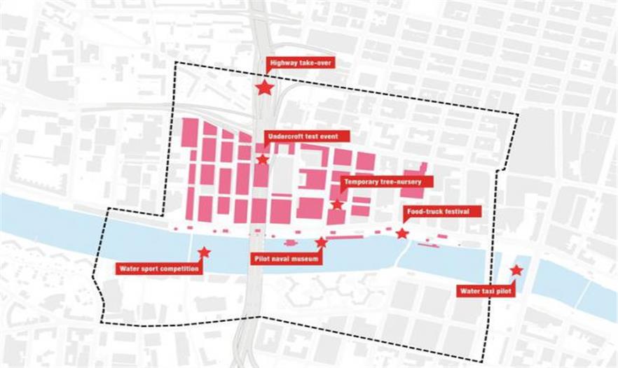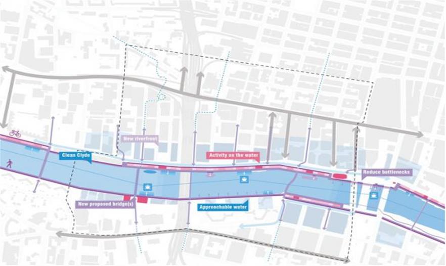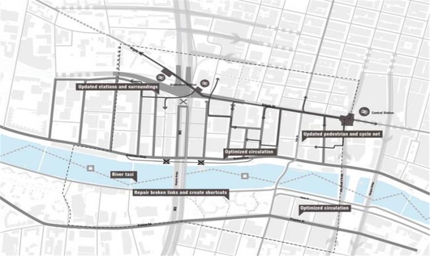 該計劃包括對市中心基礎(chǔ)設(shè)施的重大變化,打破了在市中心的四個邊緣發(fā)現(xiàn)的最具挑戰(zhàn)性的條件。重建的城市高速公路和道路系統(tǒng)將建立從公路到城市更好的交通流線,而未充分使用的,難以達到的河畔將被重新振興供公眾使用。 這些措施將市中心和臨近的社區(qū)重新連接起來,并利用死角建設(shè)綠色空間和用于休閑活動。 新的步行和自行車路線將建設(shè)和新居民的聯(lián)系。