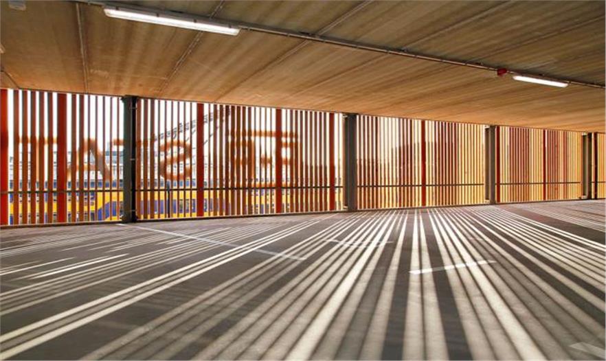 這個(gè)細(xì)長建筑的側(cè)墻與2個(gè)主要的地下通道相鄰,引導(dǎo)交通線下面的道路交通和行人。這個(gè)設(shè)計(jì)的特殊點(diǎn)在于這些廊道上面。在一端,你會(huì)發(fā)現(xiàn)這個(gè)停車場的垂直交通,采用2個(gè)螺旋結(jié)構(gòu)的坡道設(shè)計(jì)。這些焦點(diǎn)擴(kuò)展成一個(gè)向上設(shè)計(jì),使這個(gè)建筑展現(xiàn)出雕刻般的動(dòng)態(tài)形象。另一邊的墻壁直接參考了倉庫的形態(tài),貫穿其特色輪廓和木制百葉窗設(shè)計(jì)。