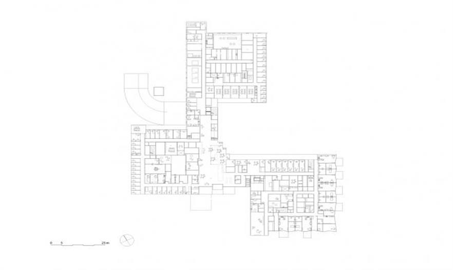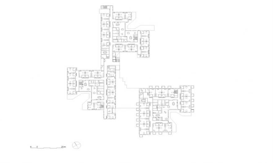 這3個(gè)主體量是南北向,與現(xiàn)有的醫(yī)院有效連接起來,并在東面建造室外花園。改變緊湊的體量就是確保居民能觀賞到優(yōu)美的景色,成為工人可用的有效系統(tǒng)。除了復(fù)雜規(guī)劃和大尺度外,這個(gè)建筑也會有建筑群中小型村莊的形象,建有體面的空間。