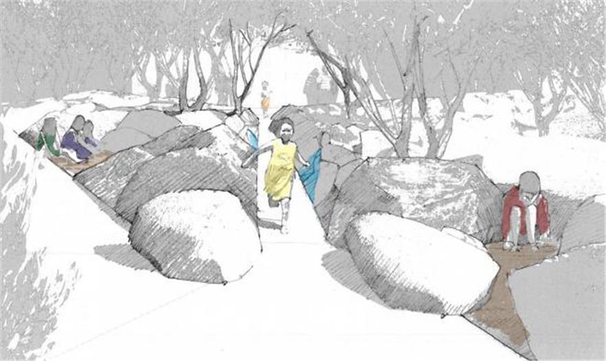 由于開放性和陽光充足,西花園設(shè)有游樂元素。本土常綠灌木林和石頭地貌營造出孩子尺度、融入式環(huán)境。水渠沿線的水景會在石頭表面和沙地游樂區(qū)上滲水,孩子們能夠利用附近的水泵或控桿激活它們。常綠灌木叢也設(shè)有圍護(hù)結(jié)構(gòu),吸收太陽能熱量,阻擋午后的風(fēng),營造出小氣候。鋪裝上嵌有波紋的形狀與圓盤和雙色玻璃,隨著燈光和觀察者的角度不斷變化顏色,吸引人們關(guān)注與太陽的關(guān)系。博物館附近的飯店和咖啡店也是用餐和舉辦活動的完美地方。這里白天用于游樂,晚上用于休息和沉思。