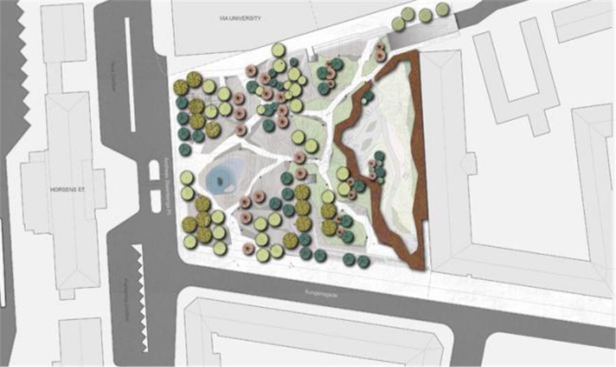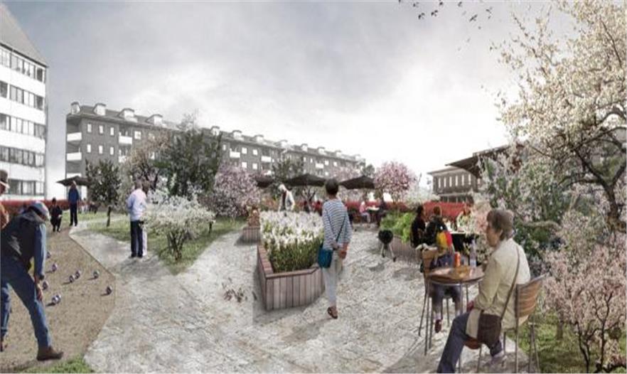 街道與新停車場(chǎng)上的綠色屋頂經(jīng)由居民可閑逛的空間、各種各樣的植物和可持續(xù)性涂層結(jié)合起來(lái)。