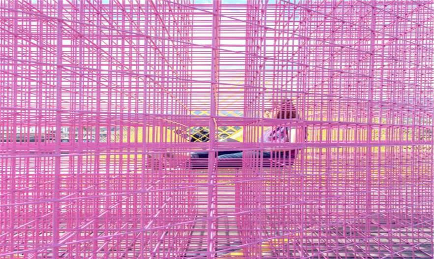 這個(gè)裝置是由3個(gè)三角形塊構(gòu)成,直線型元素建造而成,能不斷地改變位置。這些模塊——有嵌套的形狀,可以從內(nèi)部體量中拿出——在恰當(dāng)?shù)奈恢脮?huì)沒有物質(zhì)形態(tài),因?yàn)槊髁恋乃{(lán)綠色、洋紅色和黃色形狀吸引過往的目光。所謂的“loungescape”具有各種規(guī)模和功能?;诮Y(jié)構(gòu)的安排和定位,這個(gè)裝置也能用作簡(jiǎn)單的墻壁,劃定空間,或作為宏大的場(chǎng)所,如表演舞臺(tái),也能作為臨時(shí)的座位區(qū)。