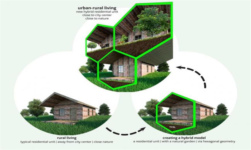 “城市鄉(xiāng)村”項目的建筑形式以風(fēng)格獨特的六邊形模塊化住宅單元為主導(dǎo)。每個六邊形單元都由一個多邊形的生活區(qū)域構(gòu)成,其中一塊凹進去的三角形場地作為灌溉花園。當(dāng)住宅單元合并時,這塊三角形場地就起到了桁架結(jié)構(gòu)的作用,在該建筑系統(tǒng),結(jié)構(gòu),景觀和美學(xué)之間形成了一個相互依賴的關(guān)系。該項目的可持續(xù)發(fā)展規(guī)劃是該計劃的核心,通過結(jié)合本地采購的材料和一個高效的模塊化組建設(shè)計,增強了該項目對環(huán)境的保護和經(jīng)濟可行性。