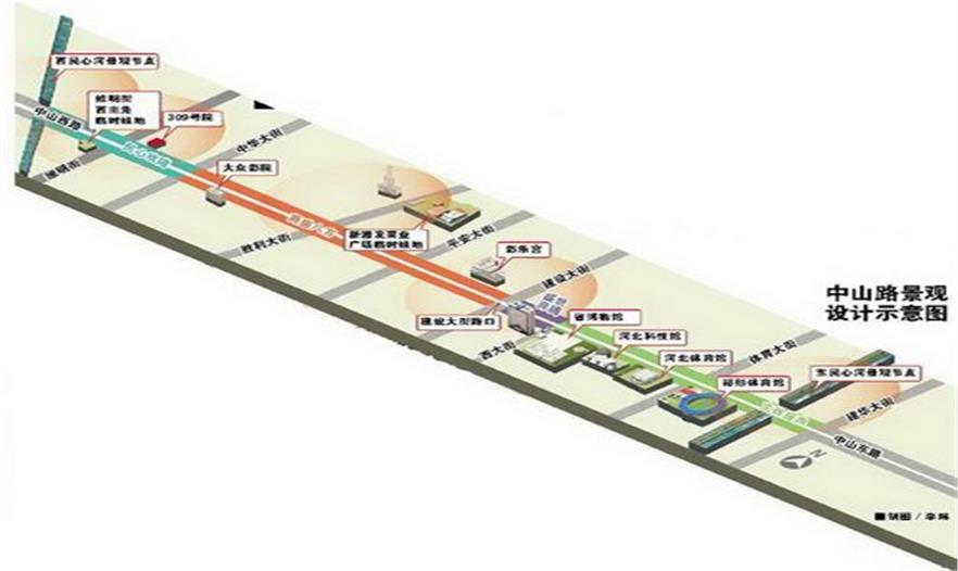 ■“十二點”是東民心河景觀節(jié)點,裕彤體育館、河北體育館、河北科技館、省博物館、影樂宮、建設大街路口、新源發(fā)商業(yè)廣場臨時綠地、大眾影院、309號院、維明街西南角臨時綠地、西民心河景觀節(jié)點。