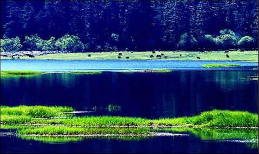 蜀都湖一個(gè)美麗的高原湖泊,湖水清澈透亮,四周青山郁郁,湖畔是一片柔軟的草場(chǎng)濕地,牛群點(diǎn)點(diǎn)黝黑,一切是那么靜謐和安詳。