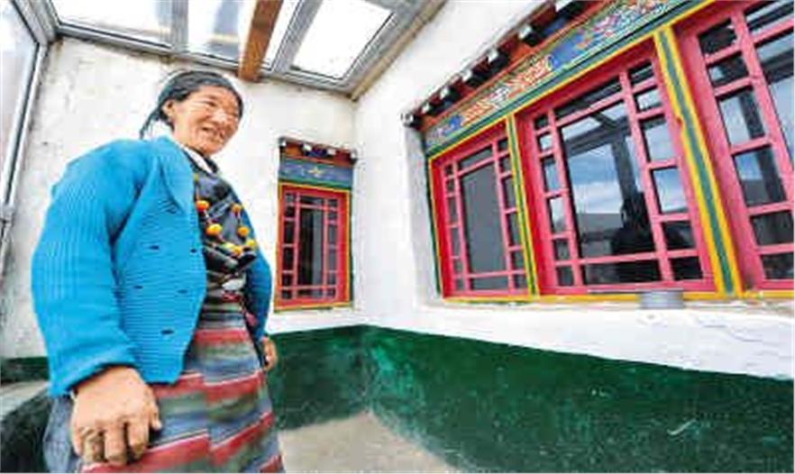 2009年6月5日,國(guó)內(nèi)首座“高原生態(tài)節(jié)能建筑”在珠穆朗瑪峰腳下的西藏自治區(qū)定日縣扎西宗鄉(xiāng)拉隆村落成。圖為示范戶玉珍老人在新居。
