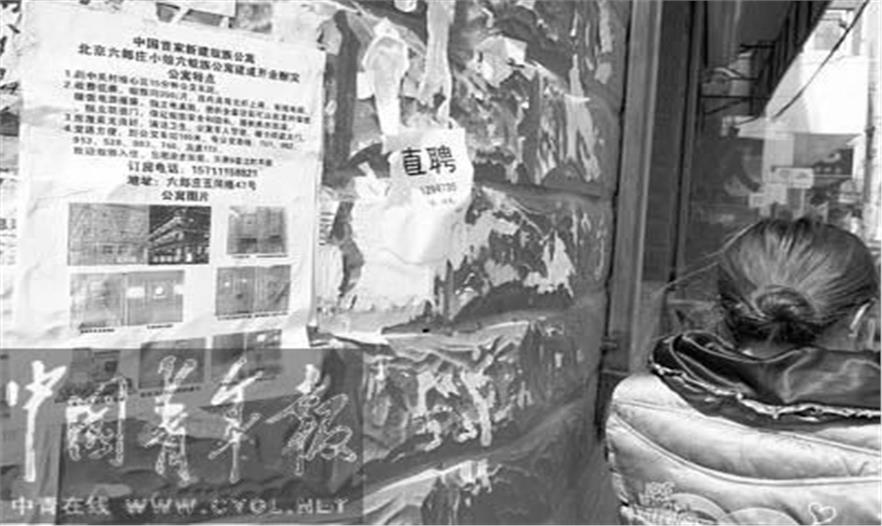在采訪中,記者發(fā)現(xiàn)有很多其他地方的租房廣告貼上了唐家?guī)X街邊的墻面。這在以出租房屋出名的唐家?guī)X是很少見的。其中,一個位于北京六郎莊號稱“中國首家新建蟻族公寓”的廣告宣稱:“歡迎唐家?guī)X蟻族入住”。