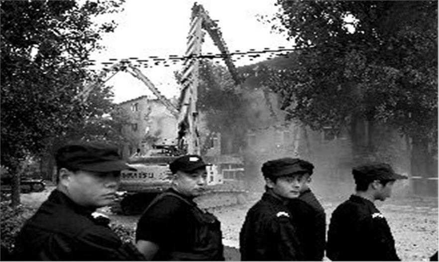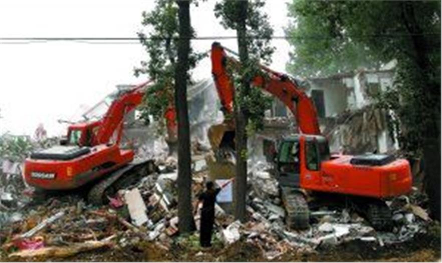 8時(shí)30分許,東北角被拉上了警戒線,城管、公安和消防部門進(jìn)行了拆遷前最后的清場(chǎng)。9時(shí)整,7臺(tái)挖掘機(jī)開始同時(shí)向盛佳網(wǎng)絡(luò)公寓掘進(jìn),不到半小時(shí),3層小樓的外立面已面目全非。同時(shí),東北角的另外幾棟待拆公寓也開始動(dòng)工,華倫公寓的平房被逐一推倒、金唐公寓變?yōu)榱艘欢淹叩[。