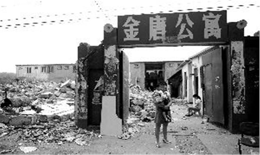 部分被拆除的金唐公寓的大門前,一名母親抱著孩子向外張望。