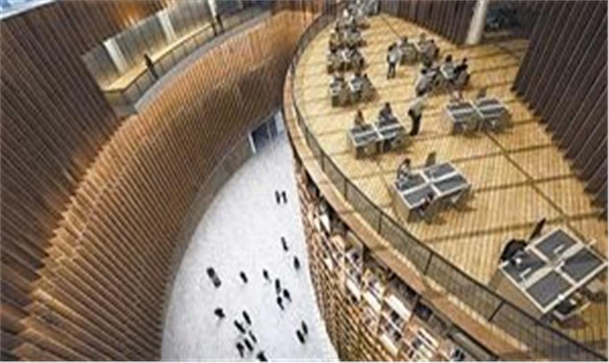 圖書館內(nèi)設(shè)中庭,通過玻璃頂引入自然光線,中庭的墻面為木制三層通高的書架,寓意“知識寶庫”。室內(nèi)的地面和墻面也多用木材,營造溫暖、舒適的閱讀氛圍。圖書館外立面主要材料為折面玻璃幕墻和豎向金屬百葉,金屬百葉隨著臺地樓板的上升逐漸變化角度,形成豐富的立面效果。一部分金屬百葉隨形體的旋轉(zhuǎn)延續(xù)至門廳內(nèi)部,使整個建筑更有邏輯感。