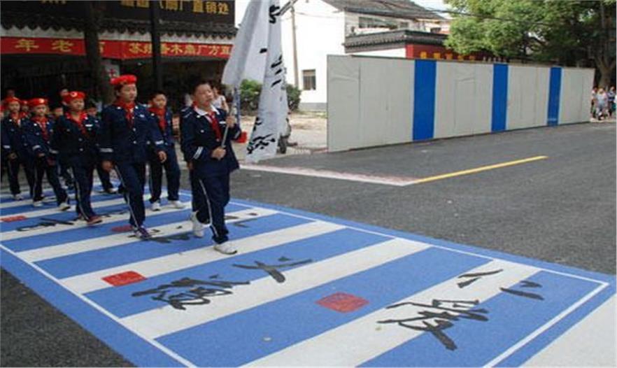 這條文化斑馬線印有唐伯虎等5位蘇州古代著名書法家的字和印鑒。圖案的白色部分為斑馬線,藍(lán)色部分代表文明、安全、和諧。整條斑馬線看上去就像一幅打開的畫卷,體現(xiàn)中國儒家文化,暗喻過往行人、車輛需要有仁愛、禮讓的意識。