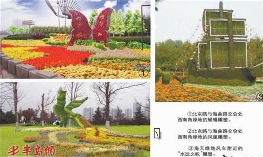 據(jù)日照市園林局海曲園藝公司劉祥軍經(jīng)理介紹,日照市園林局組織工作人員在海天綠地、人民廣場、北京路與海曲路交會處、臨沂路與迎賓路交會處、沙墩河公園、營子綠地中心花壇、東關(guān)綠地、萊凱綠地、濱河公園等市區(qū)23處綠地進行了立體化改造,安裝了運動人、水手、劍魚、姜太公釣魚、花茶、花瓶、兔子、蝴蝶、鳳凰等多個立體植物雕塑,今年的立體植物雕塑突出日照市水運主題、海洋主題、歷史文化內(nèi)涵、宜居主題、城市文化和童趣等多個主題,提升城市品位和歷史文化。