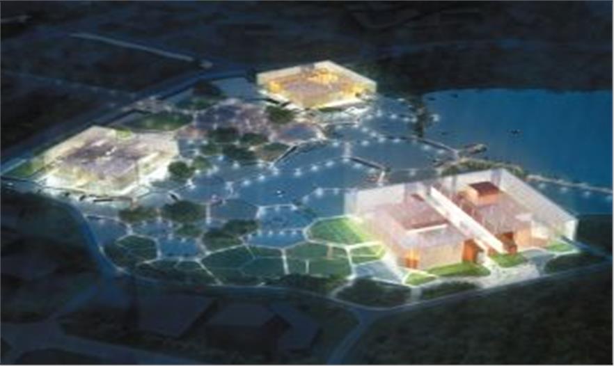 主體建筑物為三大村莊:國學(xué)村、國術(shù)村、南海殿堂,晶瑩、通透的天幕覆蓋其上。