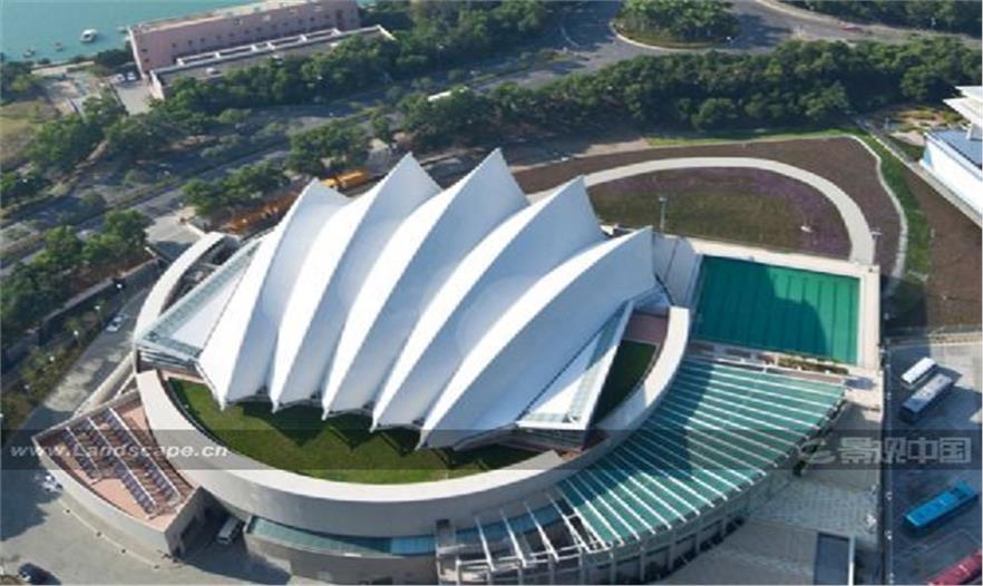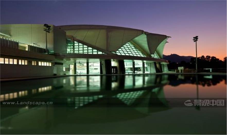 為了反映出游泳館位于海岸的地理特性和水上運(yùn)動(dòng)場(chǎng)館的功能,設(shè)計(jì)采用了“貝殼在海岸上休息”的理念,具有富有活力的空氣動(dòng)力學(xué)外形,在大跨度輕量鋼桁架體系上使用了雙層PTFE張拉膜。張拉膜作為可持續(xù)建筑的外表皮,可使得日光通過其滲透到建筑內(nèi)部,令使用者在室內(nèi)也能享受到分散、無眩的自然光。由于在雙層張拉膜之間有一層空氣絕緣層的存在,張拉膜具有高反射率和低熱傳導(dǎo)性的特性,這個(gè)非?!翱帷钡奈蓓斒沟脙?nèi)部具有很好的熱舒適度,這一點(diǎn)對(duì)于這座位于亞熱帶地區(qū)依靠自然通風(fēng)的建筑而言是至關(guān)重要的。這個(gè)靈活的屋頂同時(shí)有助于減緩室內(nèi)泳池噪音,提高使用者舒適度和救生員對(duì)溺水者呼救的警覺性。