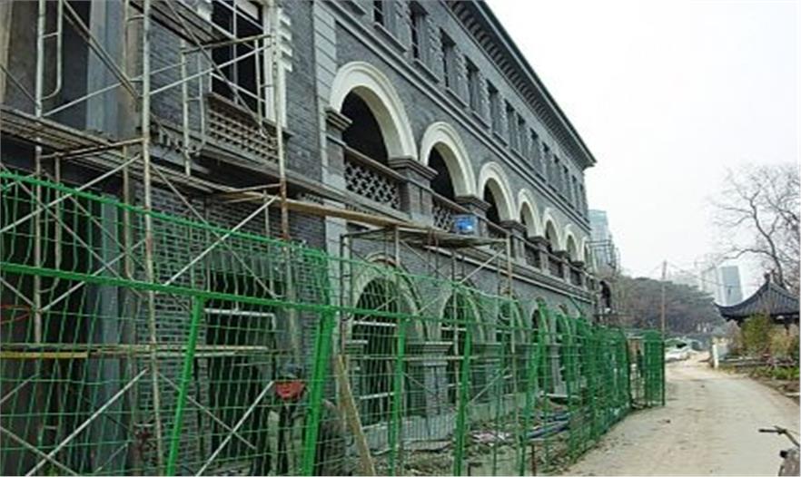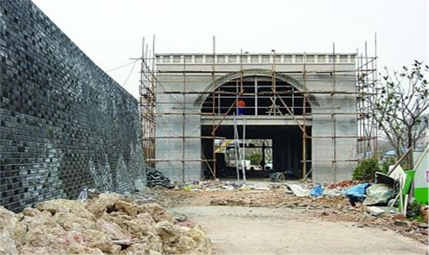 記者注意到,復(fù)建的這段明城墻高約2米多,寬度也接近兩米,順著建好的臺階可以攀登上去,沿著城墻前行,城北護(hù)城河便可盡收眼底。順著正在施工的城墻向西走,記者還發(fā)現(xiàn)了兩處同樣是青磚壘成的建筑物,靠東側(cè)的這處建筑最吸引記者的是一個個拱形的窗戶造型,現(xiàn)場施工的人員告訴記者,這處建筑的前身是一處老廠房,他們要做的就是出新。