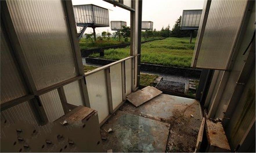 接著水泥構(gòu)造的“古樹”下,只有一對情侶依偎在此,所謂“閱讀室”下恰有一位歐師傅在看電動車說明書,他說下午沒事就來這轉(zhuǎn)轉(zhuǎn)。而這之后的建筑就真的幾乎無人問津?!皟和螒颉钡牡卮u被人挖走不少,紅色墻體上盡是白色粉筆劃下的留言;幾個高聳的“茶室”破敗不堪,其中一間連門都已經(jīng)不見,內(nèi)中的水缸被砸;“管理空間”內(nèi)擺滿了掃帚等,顯然這好幾十萬的地方成了雜物間;“多媒體室”的兩塊鋼化玻璃經(jīng)過暴曬后已經(jīng)膨脹,和中間兩塊正常的相比,已經(jīng)有明顯的碎痕,隨時有可能爆裂。