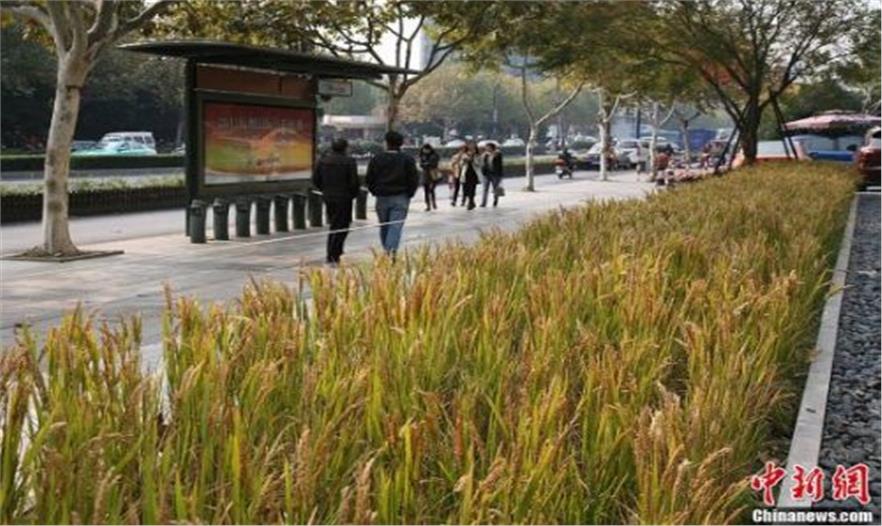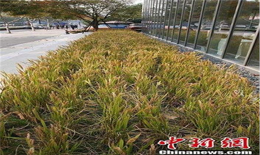 杭州市江干區(qū)慶春東路一個(gè)售樓處花壇里種的成片水稻,已滿眼金黃,頗具觀賞價(jià)值。水稻當(dāng)花“養(yǎng)”,引得路人紛紛駐足。