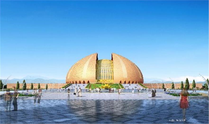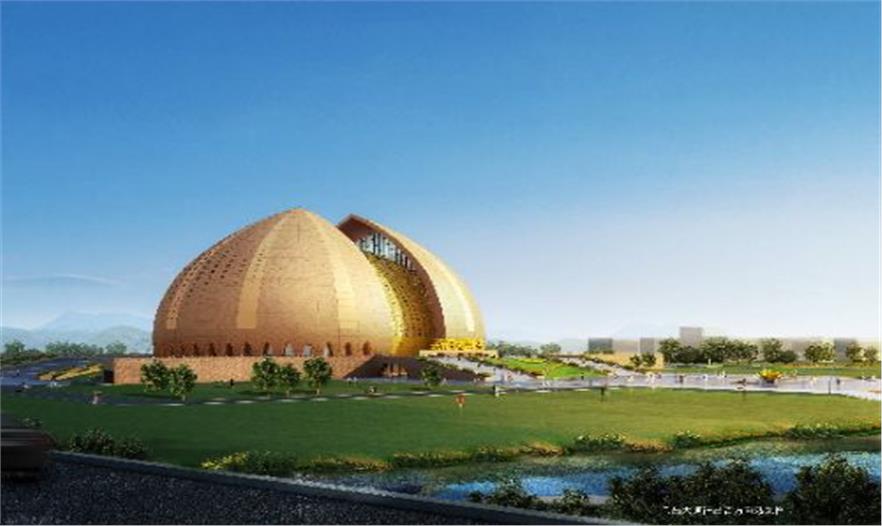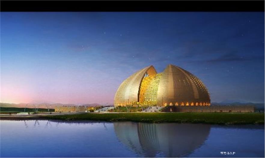 方案以天山雪蓮為原型,通過抽象與創(chuàng)新,形成里外層套的穹頂造型的主體形象。主體建筑坐落在平緩的臺(tái)基上,神似一朵天山腳下的含苞欲放的雪蓮花。大劇院外飾面通過黃褐色金屬光澤的材質(zhì)表達(dá)出輕盈、時(shí)尚的品質(zhì),內(nèi)核金色磚紋肌理表達(dá)出濃烈的新疆文化特征。