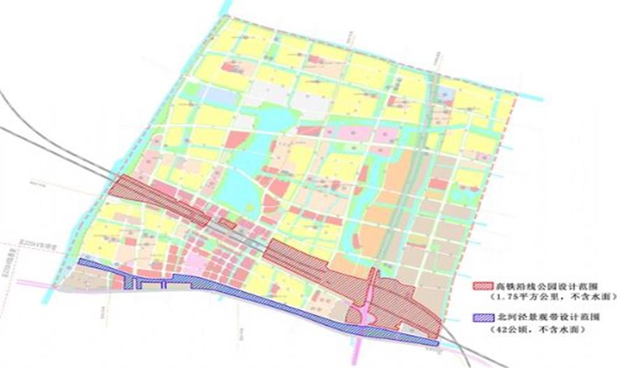 高鐵沿線景觀帶和北河涇景觀帶是高鐵新城公共空間系統(tǒng)的重要組成部分,也是展示高鐵新城形象的重要場所。對這兩個景觀帶進行高標準的規(guī)劃設(shè)計旨在彰顯蘇州市高鐵新城國際化、現(xiàn)代化、信息化、生態(tài)化的區(qū)域環(huán)境品質(zhì)和特色,突出高鐵新城“陸上空港、國際門戶”的片區(qū)形象。