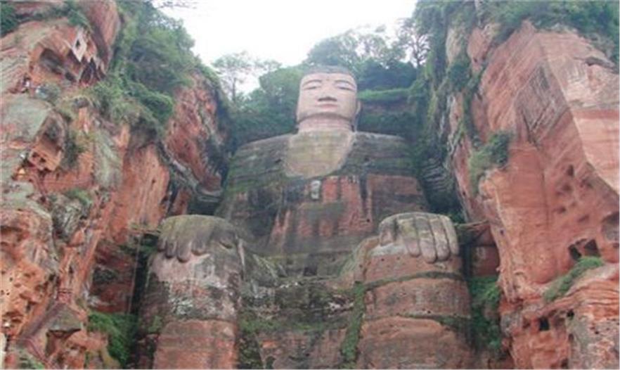 四川的樂(lè)山大佛,彌勒佛座像,石料,通高71米,公元803年建成。位于峨眉山東31公里的樂(lè)山市,依凌云山棲霞峰臨江峭壁鑿造而成,又名凌云大佛,開(kāi)鑿于唐玄宗開(kāi)元初年(公元713年),歷時(shí)90年大佛終告完成。佛像高71米,佛頭長(zhǎng)14.7米,頭寬10米,肩寬24米,耳長(zhǎng)7米,耳內(nèi)可并立二人,腳背寬8.5米,可坐百余人,素有“佛是一座山,山是一尊佛”之稱。