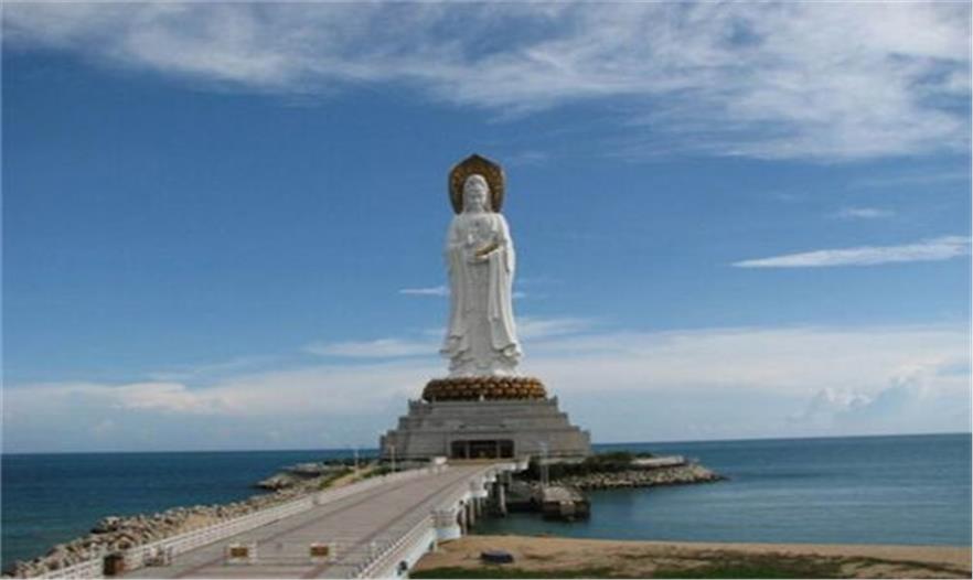 海南三亞南海海上觀音像,鋼筋混凝土材料,高達(dá)108米,比美國(guó)的自由女神像還要高15米。2005年4月24日舉行開(kāi)光大典。像體為正觀音的一體化三尊造型,寶相莊嚴(yán),腳踏108瓣蓮花寶座,寶座下為金剛臺(tái),金剛臺(tái)內(nèi)是面積達(dá)15000平方米的圓通寶殿。南海觀音像通過(guò)高科技手法,組合運(yùn)用聲、光、電技術(shù),進(jìn)行大型燈光夜景演示,充分展示了“佛光普照”的效果。