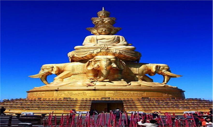 四川峨眉山金頂?shù)乃拿媸狡召t金像,是世界上最高的金佛,也是第一個(gè)十方普賢的藝術(shù)造型。金佛系銅鑄鎦金工藝佛像造像。金佛通高48米,代表的是阿彌陀佛的48個(gè)愿望。“十方”,一是意喻普賢的十大行愿,二是象征佛教中的十個(gè)方位。如果說(shuō)公元980年安坐于萬(wàn)年寺高7.85米的普賢銅像作為峨眉山千年的鎮(zhèn)山之寶,為這座佛教名山增輝千年的話,那么,高達(dá)48米的十方普賢金像,更是登峰造極之作。2005年底竣工,2006年6月18日舉行開(kāi)光儀式。