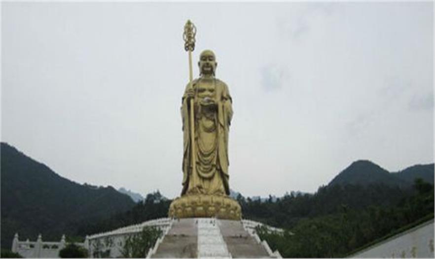 安徽九華山地藏菩薩露天大銅像,位于安徽池州市九華山下柯村景區(qū),為比丘立相,右手執(zhí)錫杖,左手托摩尼寶珠,儀態(tài)安詳,妙相莊嚴(yán)。銅像氣勢(shì)恢弘,高達(dá)99米,與九華山99座山峰、金地藏享年99歲的寓意相一致。銅像采用鑄造方式,選用仿金銅,2003年11月13日開(kāi)工,到2009年3月銅像主體結(jié)構(gòu)完工,2013年9月1日開(kāi)光。
