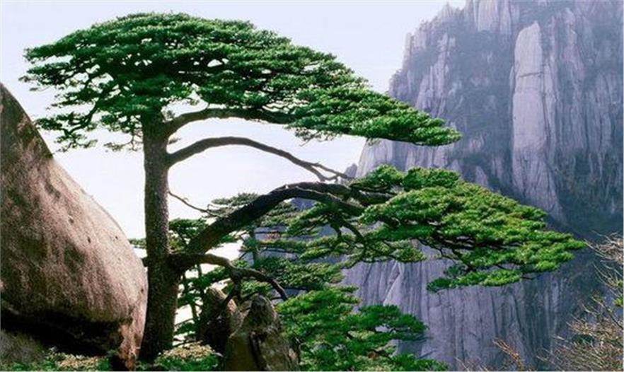 黃山迎客松位于海拔1670米處的玉屏樓左側(cè),倚獅石破石而生,高9.91米,徑0.64米,胸圍2.05米,枝下高2.54米,樹齡至少已有800年。迎客松枝干遒勁,雍容大度,姿態(tài)優(yōu)美。雖飽經(jīng)風(fēng)霜,仍郁郁蒼蒼,充滿生機(jī)。