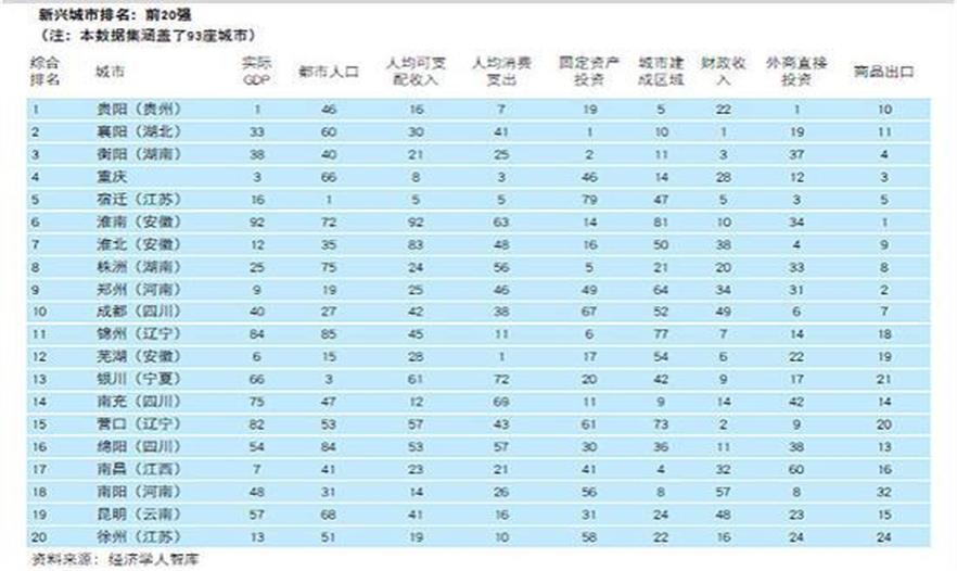 在EIU這份衡量城市“崛起速度”的排名中,內(nèi)陸省份無疑是最大的贏家。位于中西部的貴州貴陽、湖北襄陽、湖南衡陽占據(jù)了三甲的位置,位列前十名的城市還有重慶、宿遷、淮南、淮北、株洲、鄭州、成都等城市,其中只有江蘇宿遷位于“東部地區(qū)”。