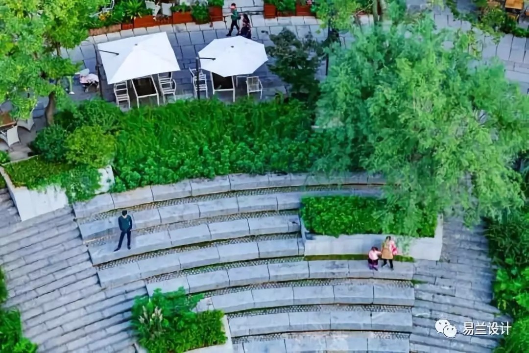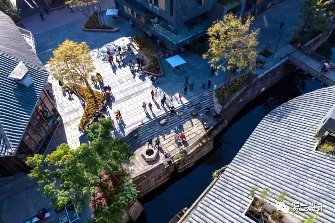 設(shè)計(jì)利用護(hù)城河水面與葫蘆口廣場(chǎng)路面之間的高差,以錯(cuò)落的青石臺(tái)階相銜接,形成了一個(gè)有圍合感的下沉廣場(chǎng),周邊的商業(yè)建筑亦呈圍合狀,雨水由環(huán)形坡屋頂落到地面,猶如四水歸堂的情景再現(xiàn)。并以此創(chuàng)造出親水的機(jī)會(huì),形成豐富的空間效果。