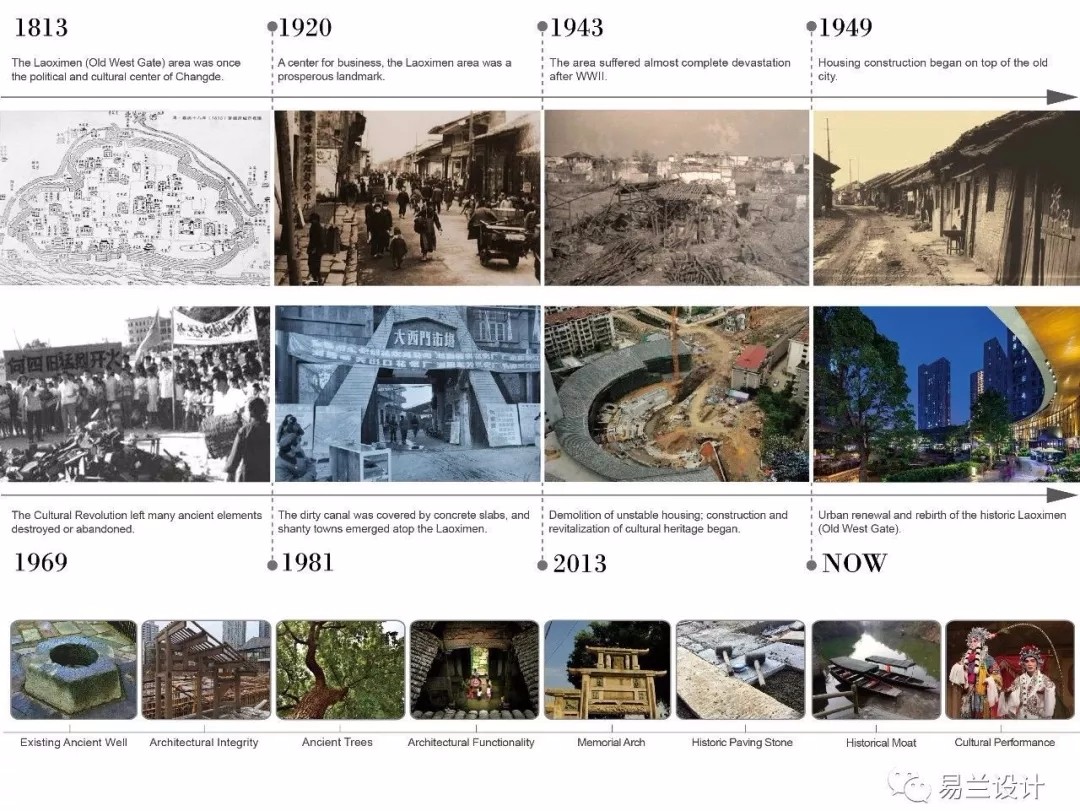 易蘭設(shè)計(jì)團(tuán)隊(duì)通過(guò)對(duì)于歷史基址和人文遺存的保護(hù)性開(kāi)發(fā)及創(chuàng)作打造,著重把護(hù)城河的恢復(fù)、疏浚與海綿城市建設(shè),老西門文脈的接續(xù)相結(jié)合,且依托護(hù)城河對(duì)常德特色建筑和人文印記進(jìn)行了一次梳理,使穿梭其間的人們能夠真切感受到時(shí)空的變遷和文化的映射。