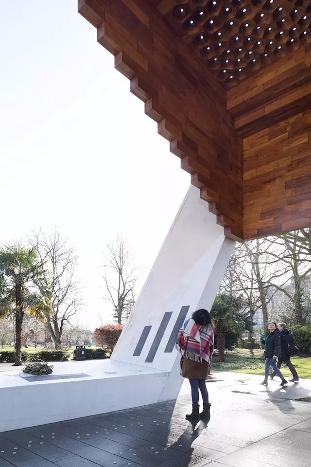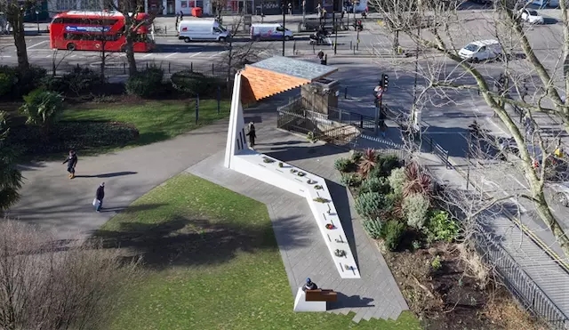 1943 年空襲期間, 173 人因為在沖往防空洞時發(fā)生的擠壓事故中死亡,這被認為是英國現(xiàn)代史上最嚴重的一起平民災(zāi)難。由 Arboreal Architecture 操刀設(shè)計的 Bethnal Green 紀念碑就位于曾經(jīng)的事發(fā)地——這里現(xiàn)已成為 Bethnal Green 地鐵站東南面的樓梯入口。設(shè)計團隊將發(fā)生悲劇的樓梯井的模型倒置在半空中,剩余的一小部分則位于公園的一個角落里。正午時分,陽光會通過樓梯頂部的錐形小孔,向刻在每一級樓梯上的遇難者的名字拋出一道光軸。
