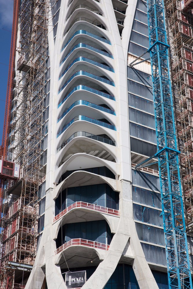 在新的視頻中我們看到了這座高達(dá)210米的塔樓的彎曲的外部結(jié)構(gòu),這是由5000塊玻璃纖維鋼筋混凝土構(gòu)成的。另外在圖片資料中還第一次展示了一些尚在建設(shè)中的內(nèi)部空間圖片,顯示出了外部結(jié)構(gòu)對內(nèi)部環(huán)境的影響。