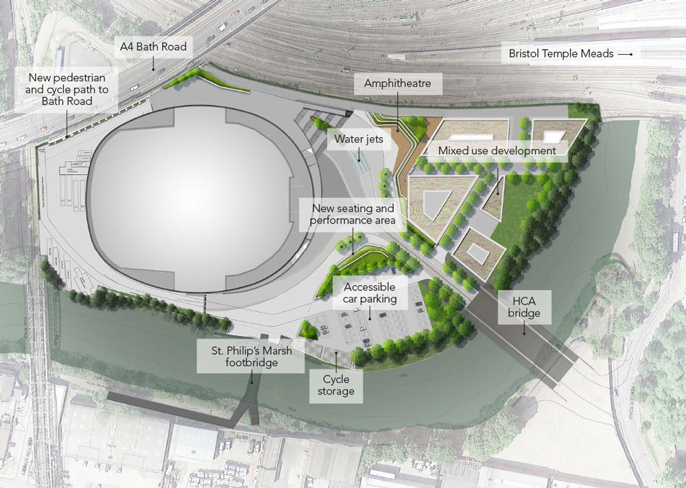 此前由 Populous 設(shè)計(jì)的這個(gè)項(xiàng)目是在2016年由 George Ferguson 市長(zhǎng)批準(zhǔn)的。這個(gè)設(shè)計(jì)被布里斯托爾的新市 Marvin Rees 擱置了,現(xiàn)在該市打算在9月對(duì)此地點(diǎn)做出最終決定。