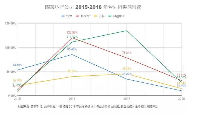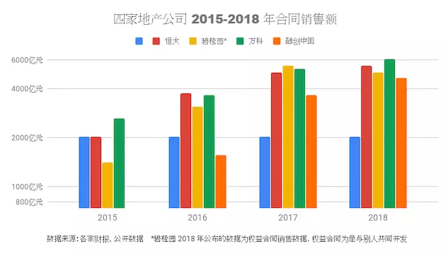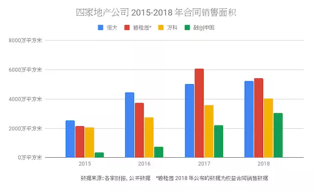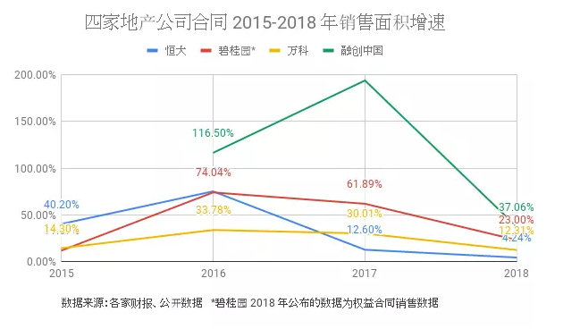 同期,萬科、碧桂園、融創(chuàng)中國等多家地產(chǎn)公司也公布 2018 年合同銷售額,增速均大幅放緩。萬科 2018 年合同銷售額和面積分別為 6069.5 億元、4037.7 萬平方米,同比增長 14.5% 和 12.3%。碧桂園公布的為權(quán)益銷售金額和面積,分別為 5018.8 億元、 5416 萬平方米,同比增長 31.25% 和 23.06%。
