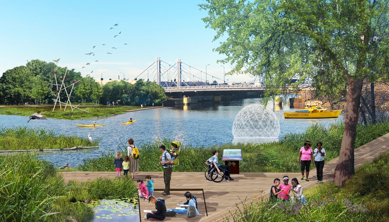 SOM 建筑事務(wù)所日前公布了世界第一座沿芝加哥河建造的水上浮動生態(tài)公園的設(shè)計方案。該項目被稱為“芝加哥野外一英里”( Wild Mile Chicago),位于芝加哥和鵝島東側(cè)的北大街之間。一個名為“城市河流”的生態(tài)學(xué)者和活動人士團體正在與該市合作,以實現(xiàn)這一計劃。這個長達一英里的項目是由政府官員和私人開發(fā)商共同開發(fā)的,希望能夠增加一些新的野生動物,同時建設(shè)娛樂和教育等設(shè)施。