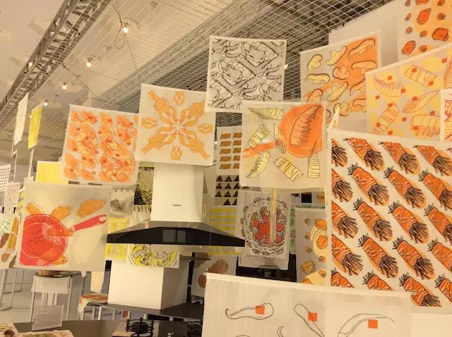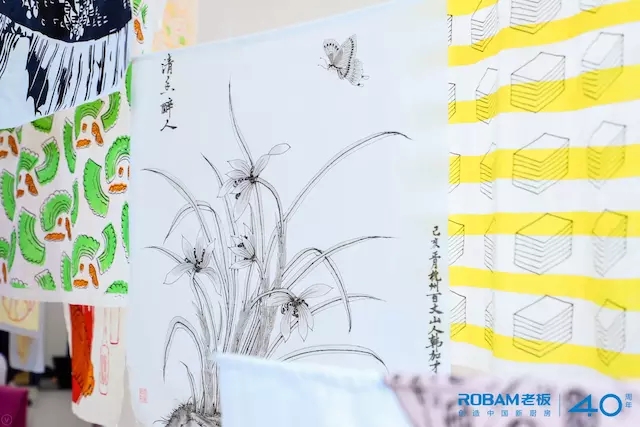 這也成了老板電器近年的品牌策略,他們已經(jīng)和品物流形在“設計上?!焙献髁巳?。目前合作沒有細化到廚具產(chǎn)品設計上,設計師做的更多是設計類似于展覽、畫作上圖案等品牌活動元素。前兩年展覽的主題是“水的一生”和“24 膳”,分別展出的是金屬編織工藝品,用來描述水循環(huán)的過程、以及以 24 節(jié)氣的食物為題材的銀制簪花工藝品。今年,有絲網(wǎng)畫圖案的圍裙、杯墊、環(huán)保袋在現(xiàn)場售賣。
