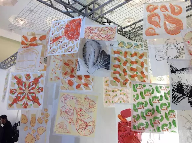 聯(lián)合設計品牌品物流形,老板電器的展位被設計成了以中國傳統(tǒng)烹飪?yōu)橹黝}的“食嶼”展覽。他們把展出的廚具按照“蒸、煮、炒”的烹飪方式分類擺放,廚具上方掛了 400 多幅相應題材的的絲網(wǎng)印刷布質(zhì)畫,有 150 多種花樣,模仿的是傳統(tǒng)灶臺上表示吉利的灶臺畫。比如在“蒸”的部分,畫的內(nèi)容就以螃蟹、蒸餃等食物為主,而“煮”的部分有湯圓和八寶粥等。據(jù)老板電器的李佳介紹,畫布材質(zhì)輕盈,是用來比喻傳統(tǒng)土灶的炊煙。