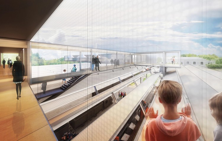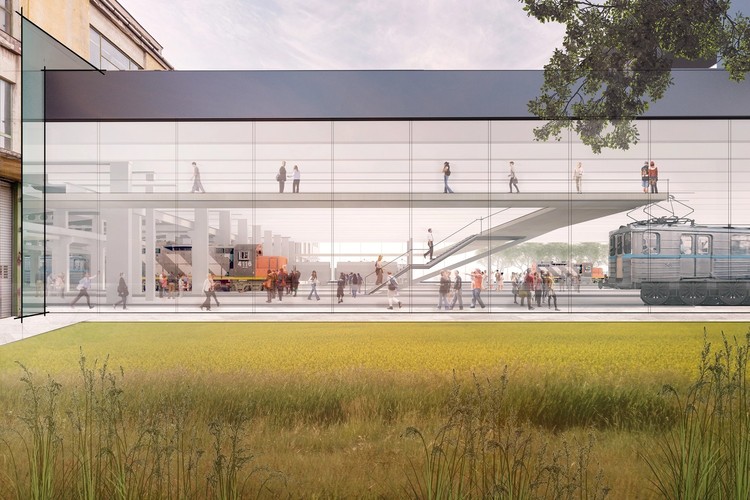 兩年前,交通博物館被搬離了瓦洛斯蒂謝(Varosliget),并且匈牙利政府決定把博物館重新安置在位于克班亞(K?banya)的一塊面積為7公頃的土地,這曾是布達(dá)佩斯的一個(gè)舊工業(yè)區(qū)。DS+R與當(dāng)?shù)亟ㄖ聞?wù)所Teampannon合作,設(shè)計(jì)了一個(gè)新的前院,其中將包含室外畫(huà)廊、野餐區(qū)、森林、咖啡館、兒童游樂(lè)場(chǎng),以及供社區(qū)使用的托雷克維斯(Torekves)文化中心的戶外空間。博物館的藏品也將從室內(nèi)延伸到前院:在畫(huà)廊大廳西側(cè)立面,火車(chē)頭和車(chē)廂將在一系列突出式玻璃櫥窗中展出,這也模糊了博物館和公共空間之間的界限。