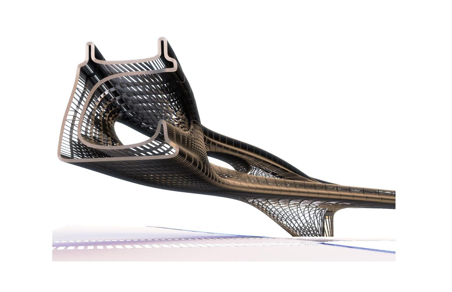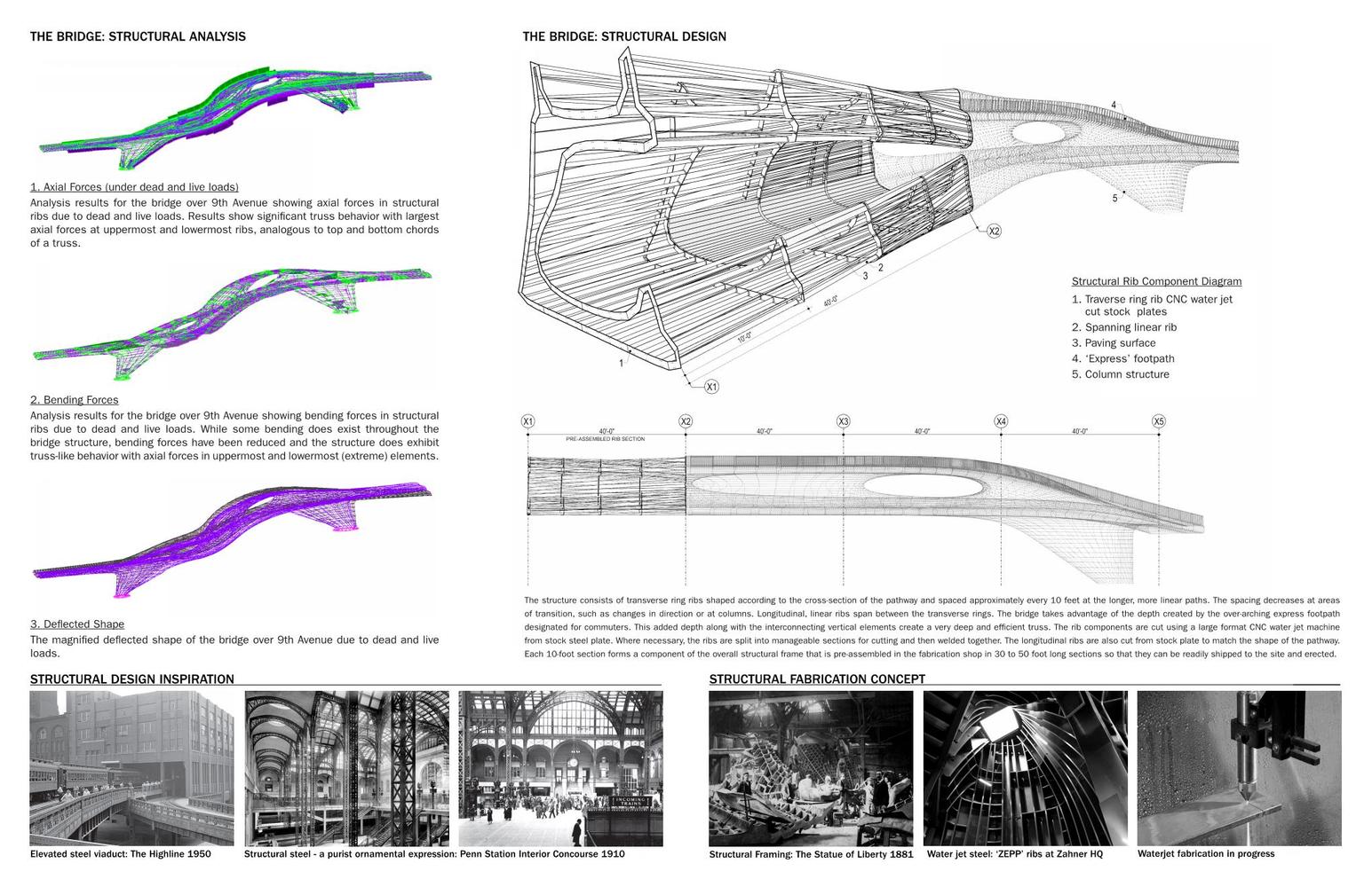 19世紀(jì)自由女神像的結(jié)構(gòu)框架概念。如今,彎曲的結(jié)構(gòu)框架可以用噴水切割鋼和預(yù)制裝配來完成。該設(shè)計(jì)旨在于繁忙的大道之上創(chuàng)造一條流線優(yōu)美的人行道。