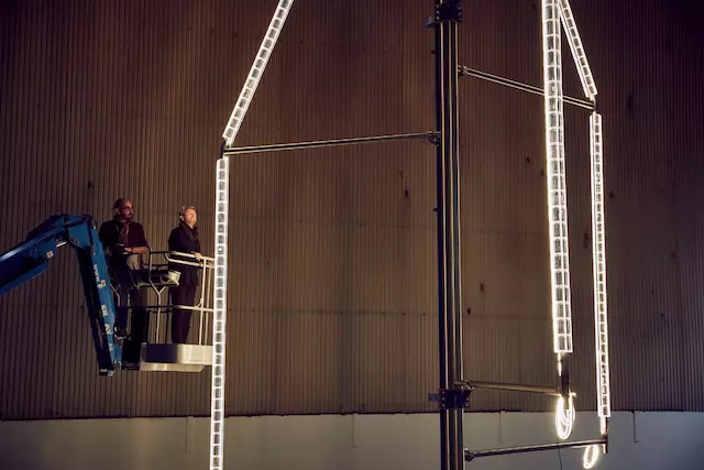 據(jù) Dezeen,每座噴泉被設(shè)在獨(dú)立的水池中,主體是中央的青銅樹形支架,它支撐著上面懸掛著的、有折角的輸水管道,上面排列著水晶和 LED 燈。水通過這些管道向下噴入水池,在這同時(shí)噴泉會(huì)緩慢旋轉(zhuǎn)。白天,水晶在陽光下閃光,而夜晚的噴泉由 LED 燈照亮。