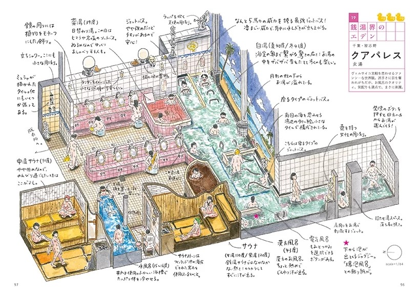 鹽谷步波通過插畫和鳥瞰的方式,向我們展示了人們?nèi)菀缀雎缘募?xì)節(jié)。她測量、拍攝并研究澡堂,用建筑插圖展示了東京的24個公共澡堂。現(xiàn)在更多的人稱呼鹽谷步波為建筑藝術(shù)家。