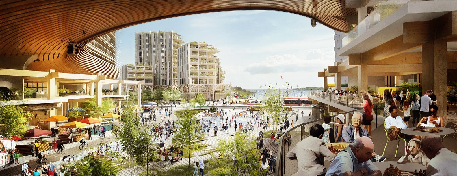 作為谷歌母公司Alphabet旗下子公司,Sidewalk Labs希望通過(guò)提供新崗位與住房,挖掘東部海濱區(qū)發(fā)展?jié)摿?,同時(shí)刺激經(jīng)濟(jì)增長(zhǎng)。在公布18個(gè)月后,完整提案展示了多種規(guī)劃與設(shè)計(jì)細(xì)節(jié)如何更好地協(xié)作。在完整版本中,MIDP描繪了碼頭區(qū)將如何通過(guò)物理、數(shù)字以及政策的更新實(shí)現(xiàn)性價(jià)比、可持續(xù)性以及生活品質(zhì),同時(shí)創(chuàng)造更多經(jīng)濟(jì)發(fā)展的機(jī)遇。該項(xiàng)目將建設(shè)可容納2500戶居住單元的木塔,其中1000戶將以低于市場(chǎng)的價(jià)格出租,用于聯(lián)合辦公、商業(yè)或是居住。
