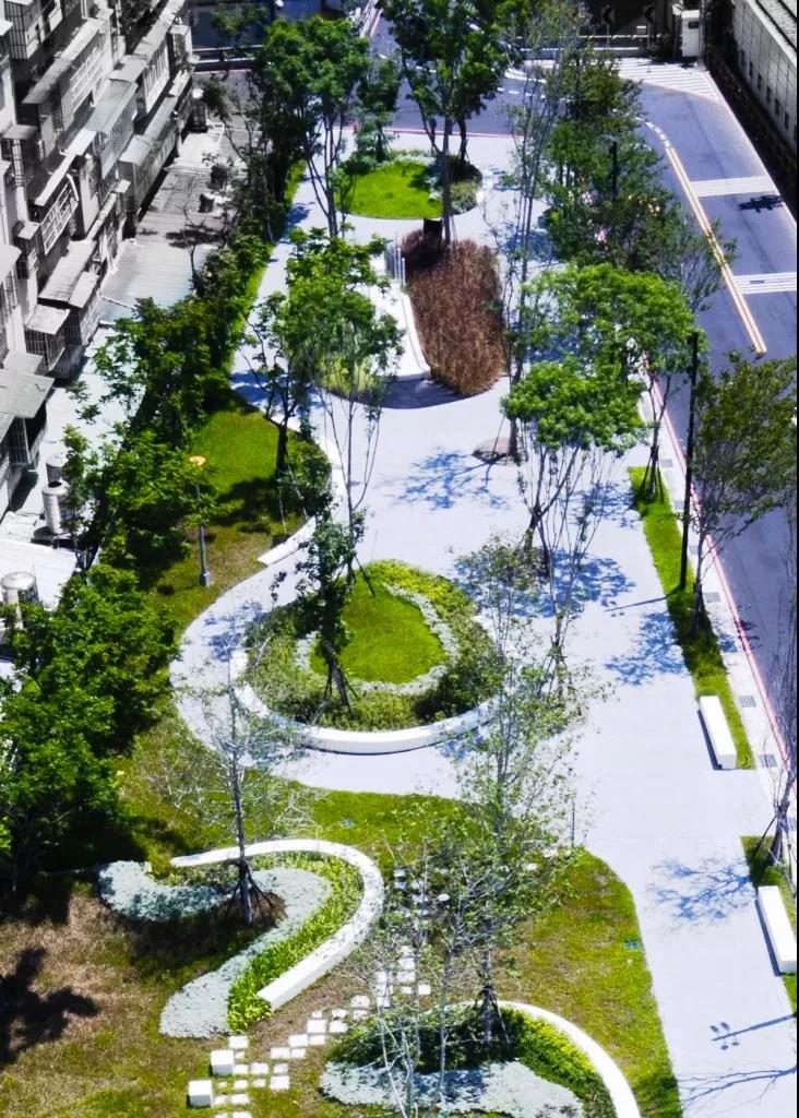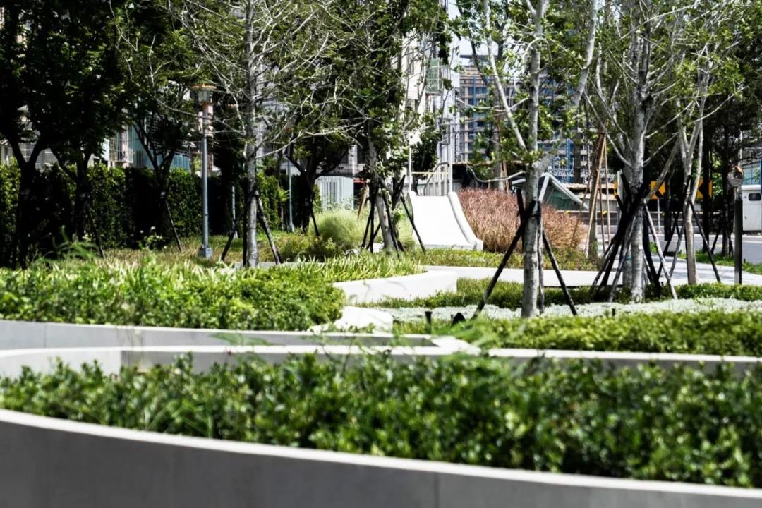 至于路面和綠化的比例變化,流通自由地穿過綠地; 為了適應周圍環(huán)境而建造的街道設施或座椅散落在土地上,提供臨時休息空間。整個空間由完全流動或半流動的空間組成,但全部用于休息。周圍的道路允許乘客快速通過; 對于嬰兒車,步行者或讀者來說,他們總能找到適當的地方休息,或在不干擾他人的情況下進行預定的活動。